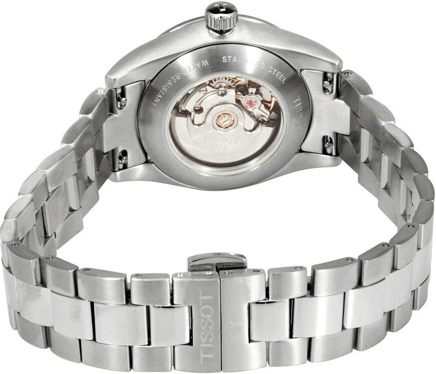 Метки в виде штрихов. Окошко даты находится в положении 3 часа. Рифленая заводная головка. Прозрачная задняя крышка. Надежный стальной браслет с раскладывающейся застежкой.
