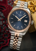 Окошко даты в положении 3 часа. Рифленая заводная головка. Стальной браслет с застежкой-бабочкой.