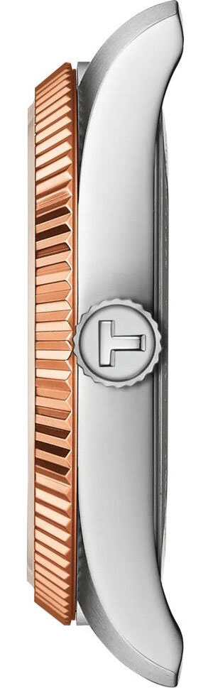 Окошко даты в положении 3 часа. Рифленая заводная головка. Стальной браслет с застежкой-бабочкой.