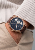Сквозь прозрачное окошко на циферблате можно наблюдать за работой механизма часов. Рифленая заводная головка с защитой. Удобный кожаный ремешок с классической застежкой.
