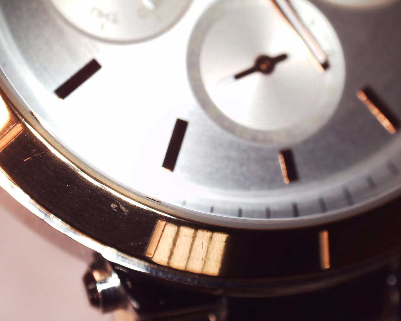 Emery. Циферблат выполнен по технологии Sunray (солнечные лучи). Метки в виде штрихов. 12-ти и 24-х часовой формат времени. Время в 24-х часовом формате, дата и день недели вынесены на отдельные циферблаты. Браслет с раскладывающейся застежкой. Кнопки около заводной головки неподвижны и выполняют декоративную функцию.