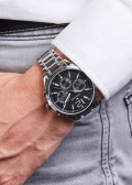 Время в 24-х часовом формате, дата и день недели вынесены на отдельные циферблаты. Рифленая заводная головка. Браслет с раскладывающейся застежкой.