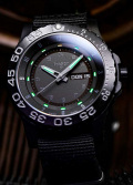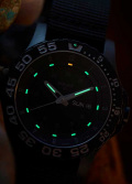 TrigaLight подсветка на основе тритиевого газа не тускнеет в течение длительного использования (ресурс до 25 лет). Заостренные прямоугольные стрелки в стиле Baton. Заводная головка с защитой. Индивидуальный номер, выгравированный на задней крышке. Тканевый ремешок с классической застежкой.