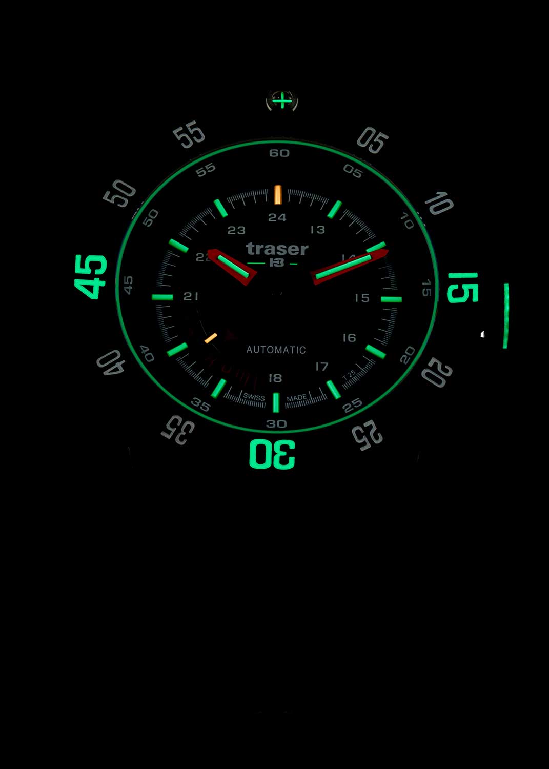 Массивный двунаправленный безель с 60-минутной шкалой и шагом 60 щелчков, дополнен крестиком из тритиевых трубок в положении 12 часов. Защищен от ударов благодаря ребристой поверхности. Часы защищены от магнитных полей. 12-ти и 24-х часовой формат времени.