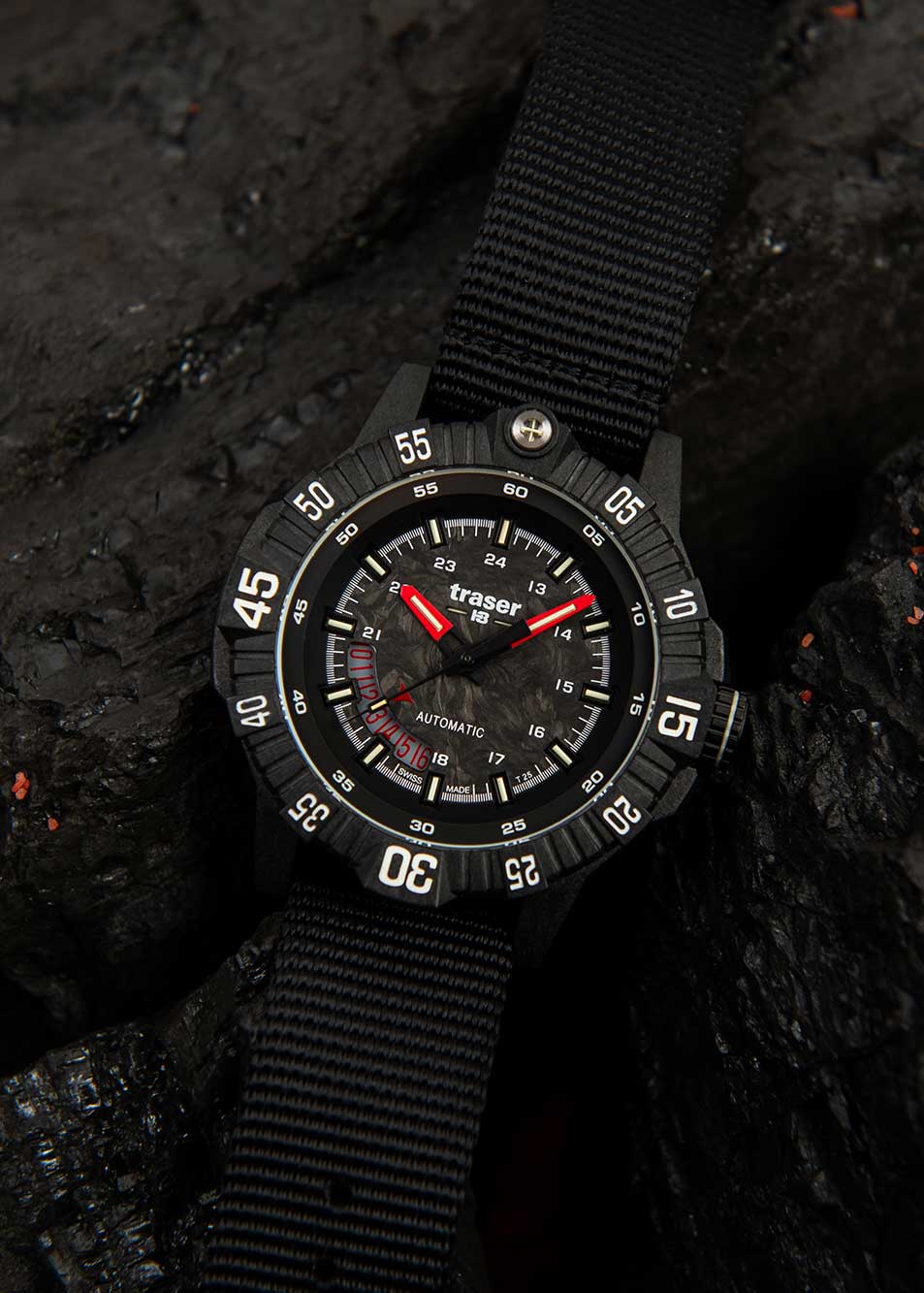 Текстурированный циферблат из углеродного волокна. Благодаря использованию тритиевой подсветки и Superluminova читаемость часов становится идеальной в любых условиях освещения. TrigaLight-подсветка на основе тритиевого газа не тускнеет в течение длительного использования (ресурс до 25 лет). Технология SuperLuminova применяется для подсветки уплотнителя стекла и заводной головки.