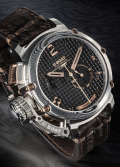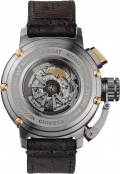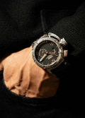 Рифленая заводная головка с системой блокировки расположена слева, что обеспечивает комфортное ношение на правой руке. Стальная задняя крышка с прозрачным окошком из минерального стекла закреплена на 5 болтов. Кожаный ремешок из телячьей кожи со швами из вощеного хлопка оснащен классической застежкой.