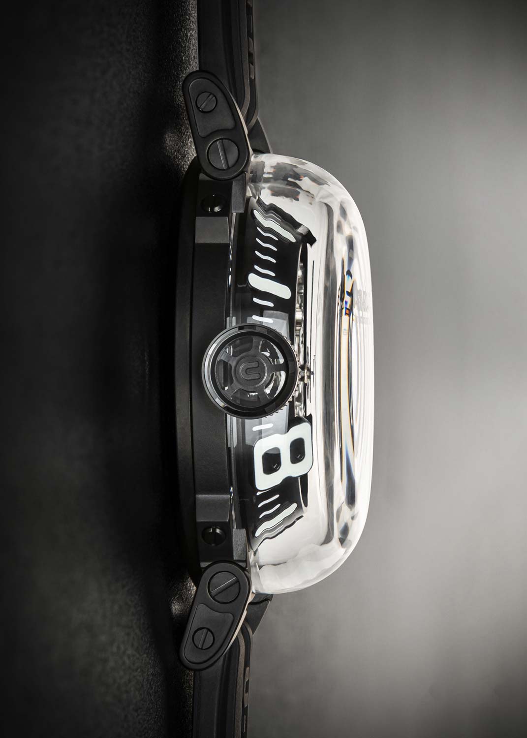 Стрелки и метки с люминесцентным покрытием SuperLuminova, которое светится в темноте после непродолжительной зарядки на свету. Рифленая заводная головка со вставкой из минерального стекла расположена слева, что обеспечивает комфортное ношение на правой руке.
