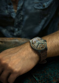 Циферблат с фактурой состаренной бронзы и метками в виде штрихов, арабских цифр 4, 8 и английской буквы U на отметке 12 часов. Стрелки с люминесцентным покрытием SuperLuminova, которое светится в темноте после непродолжительной зарядки на свету. Рифленая завинчивающаяся заводная головка с защитой расположена слева, что обеспечивает комфортное ношение на правой руке. Уникальная система блокировки задней крышки с быстрой заменой батарейки. Кожаный ремешок со швами из вощеного хлопка оснащен классической застежкой.