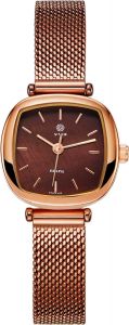 Женские часы с японским механизмом. Перламутровый циферблат с метками в виде штрихов. Рифленая заводная головка. Браслет миланского плетения.