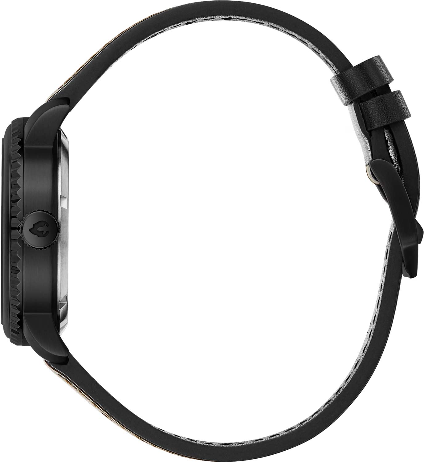 Ремешок из натуральной кожи с перфорацией, напоминающей направляющие для снарядов. В комплекте памятный брелок.