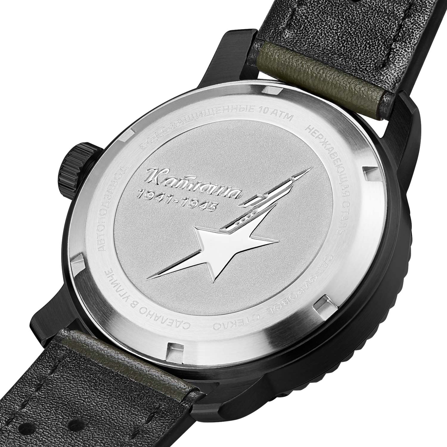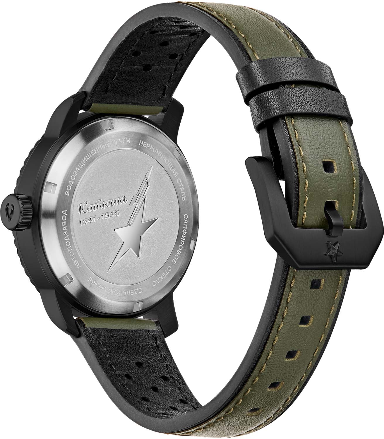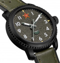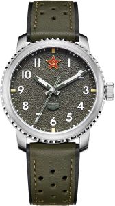 Мужские наручные часы. Запас хода 42 часа. Круглый стальной корпус с рифленым безелем напоминает покрышку с протектором. Циферблат защитного цвета украшен алой звездой и защищен прочным сапфировым стеклом. Метки в виде арабских цифр и штрихов. Геометрия стрелок напоминает форму снарядов.