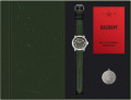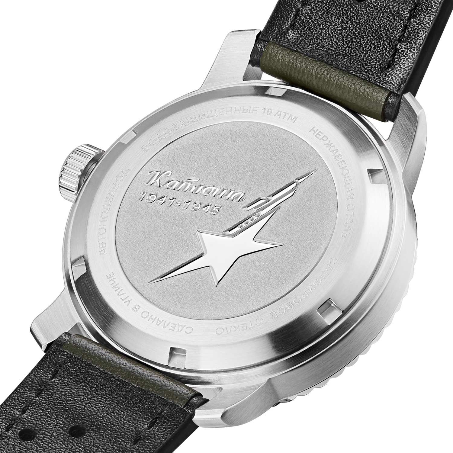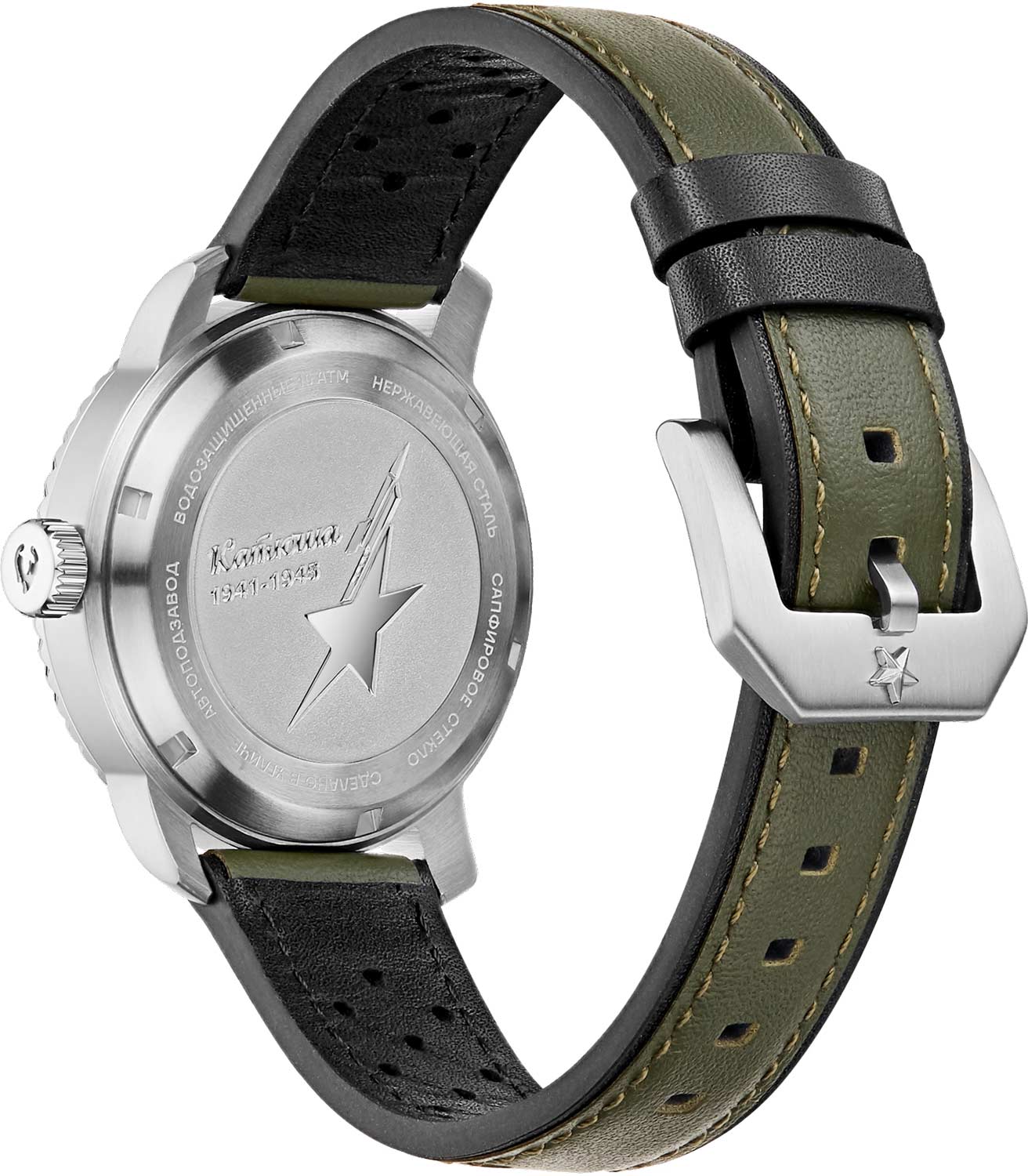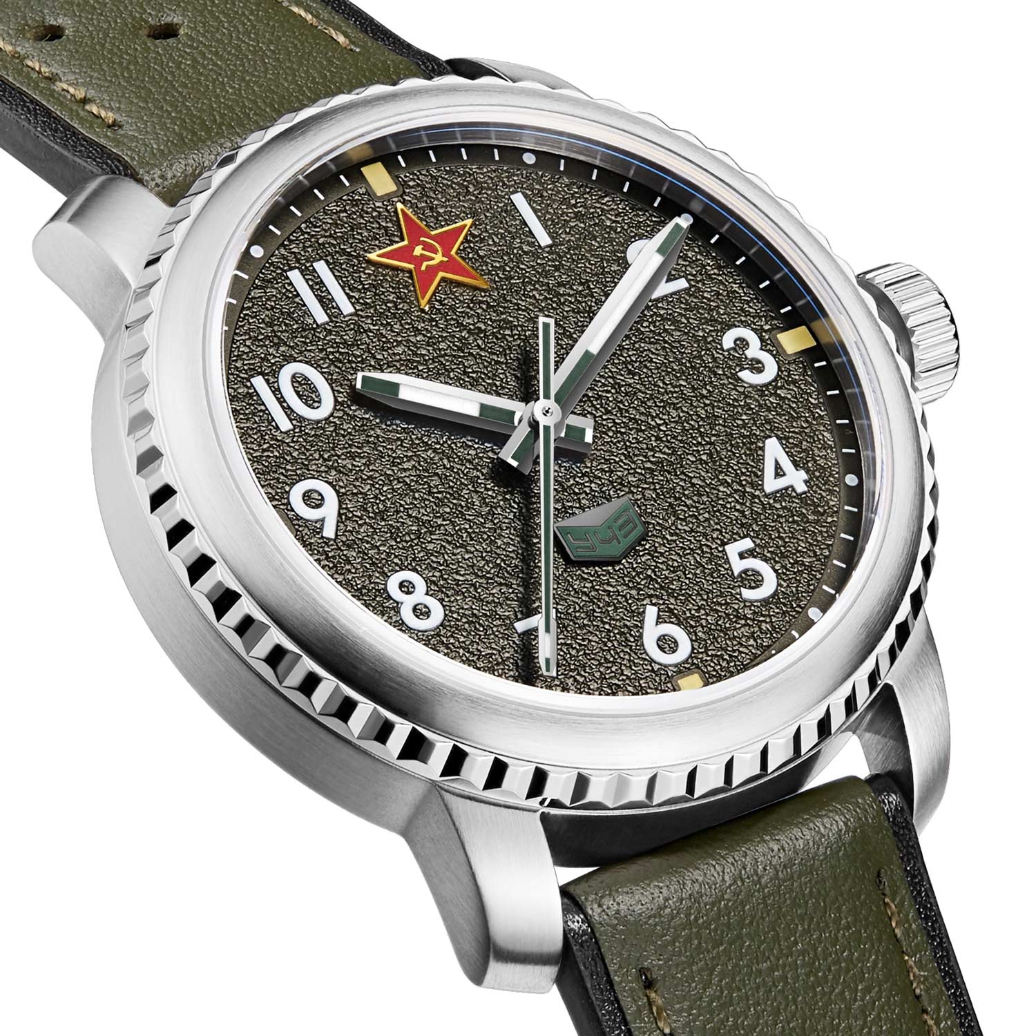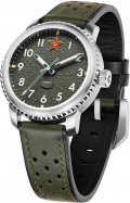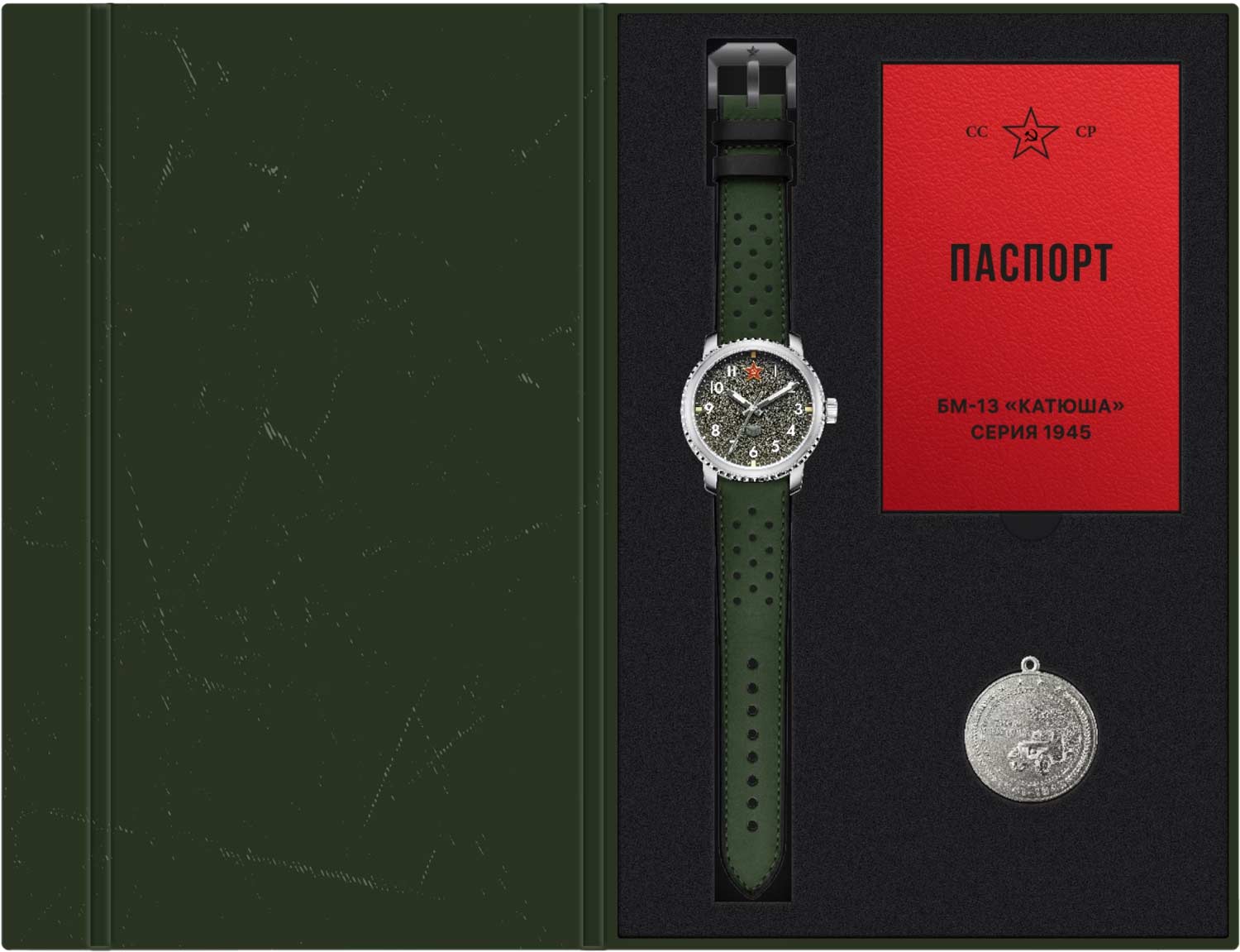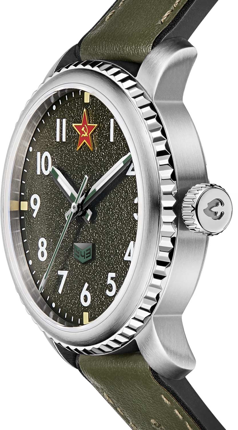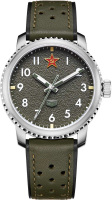Мужские наручные часы. Запас хода 42 часа. Круглый стальной корпус с рифленым безелем напоминает покрышку с протектором. Циферблат защитного цвета украшен алой звездой и защищен прочным сапфировым стеклом. Метки в виде арабских цифр. Геометрия стрелок напоминает форму снарядов.