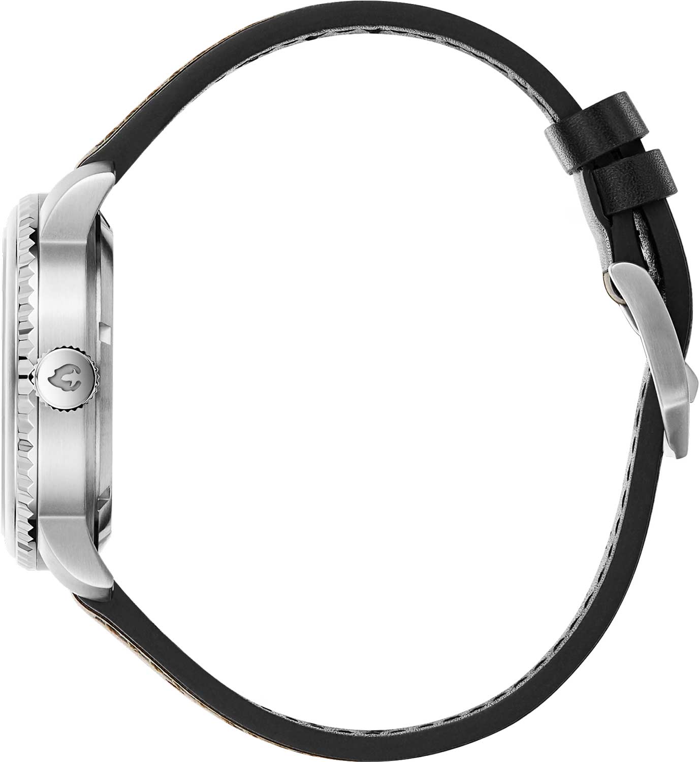 Ремешок из натуральной кожи с перфорацией, напоминающей направляющие для снарядов. В комплекте памятный брелок.