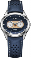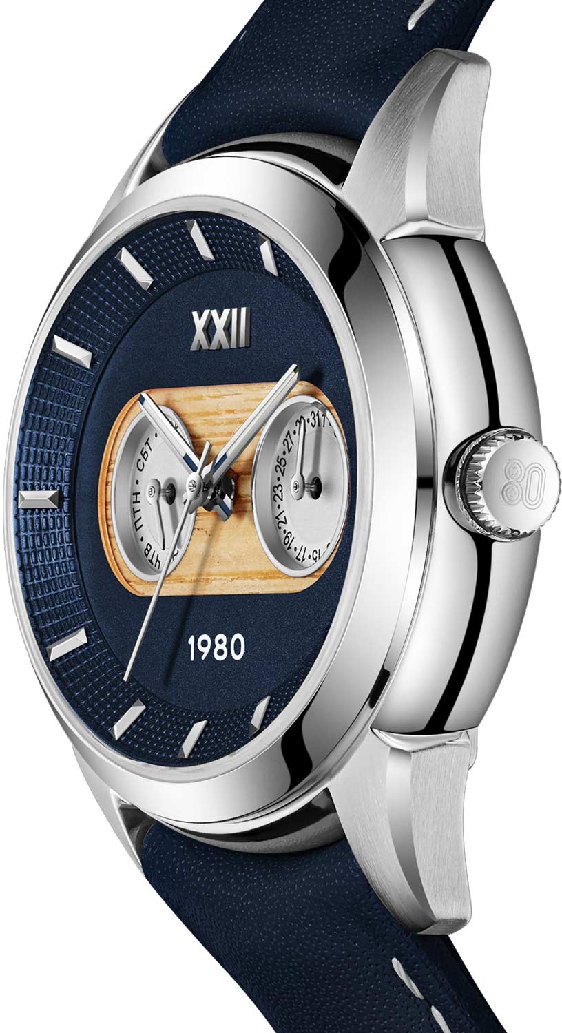 Метки в виде штрихов. Дата и день недели вынесены на отдельные малые циферблаты. Рифленая заводная головка с гравировкой ''80''.