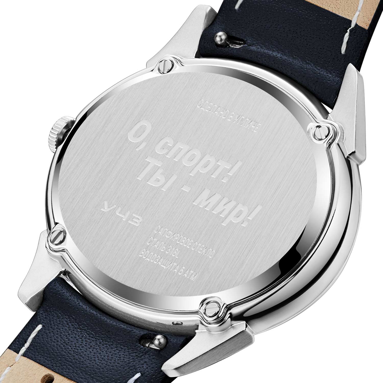 Задняя крышка крепится на 4 винтах и украшена известной фразой основателя современного олимпийского движения Пьера де Кубертена ''О спорт! Ты — мир!''. Удобный перфорированный ремешок из натуральной кожи с классической застежкой.