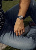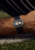Кварцевые наручные часы. Овальный стальной корпус напоминает изгибы велотрека. Циферблат со скошенными гранями, воссоздающими узнаваемый силуэт переполненных трибун, защищен прочным сапфировым стеклом. Центральная вставка из натурального дерева как отсылка к деревянному покрытию олимпийских спортивных объектов.