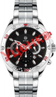 Часы-хронограф с секундомером. 12-ти и 24-х часовой формат времени. Циферблат с метками в виде штрихов. Окошко даты находится в положении между отметками 4 и 5 часов. Безель украшен декоративными болтами. Заводная головка с защитой. Браслет с раскладывающейся застежкой.