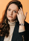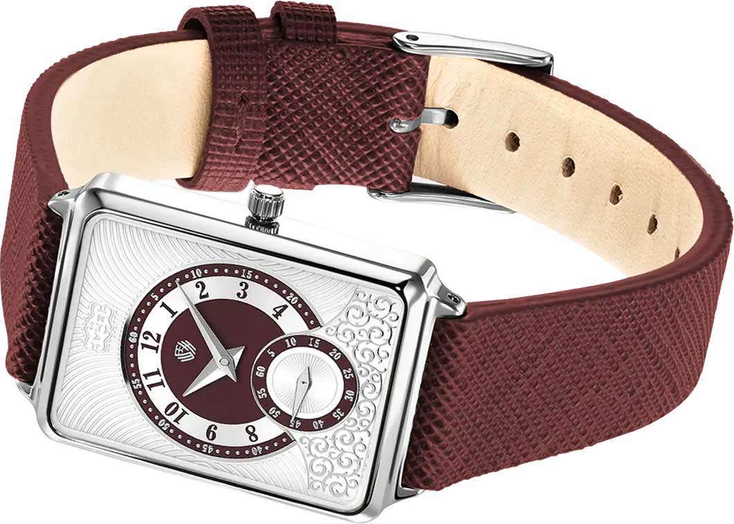 Вынесенная секундная стрелка обрамлена виньетированным орнаментом, композиционно напоминающим классические настольные часы. Рифленая заводная головка. Рельефный ремешок из итальянской кожи с классической застежкой.