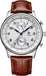 УЧЗ Spectr. Мужские кварцевые часы с тахиметром. Круглый латунный корпус. Двухуровневый циферблат с метками в виде накладных арабских цифр защищен минеральным закаленным стеклом. По краю циферблата нанесена минутная шкала. Указатели даты и дня недели вынесены на отдельные циферблаты. Рифленая заводная головка. Удобный кожаный ремешок с имитацией под кожу рептилии.