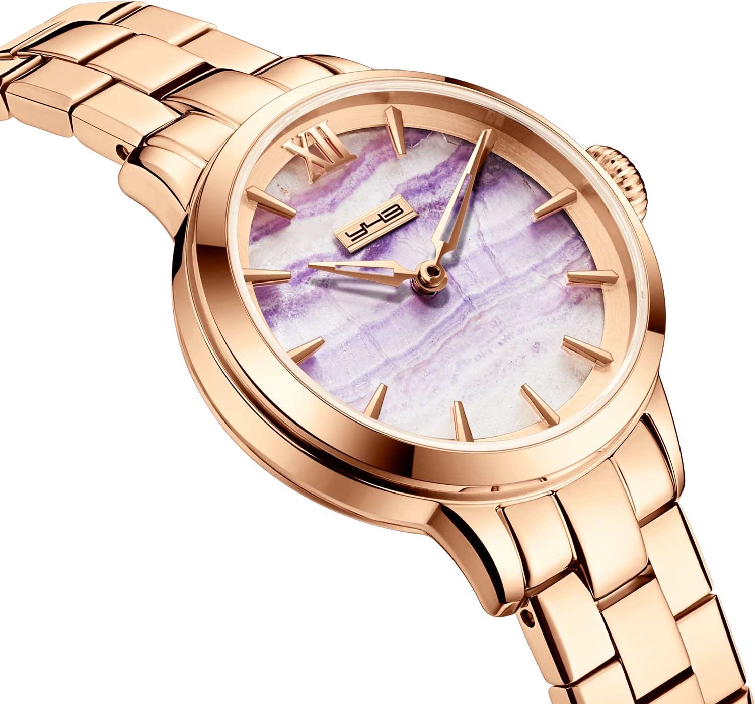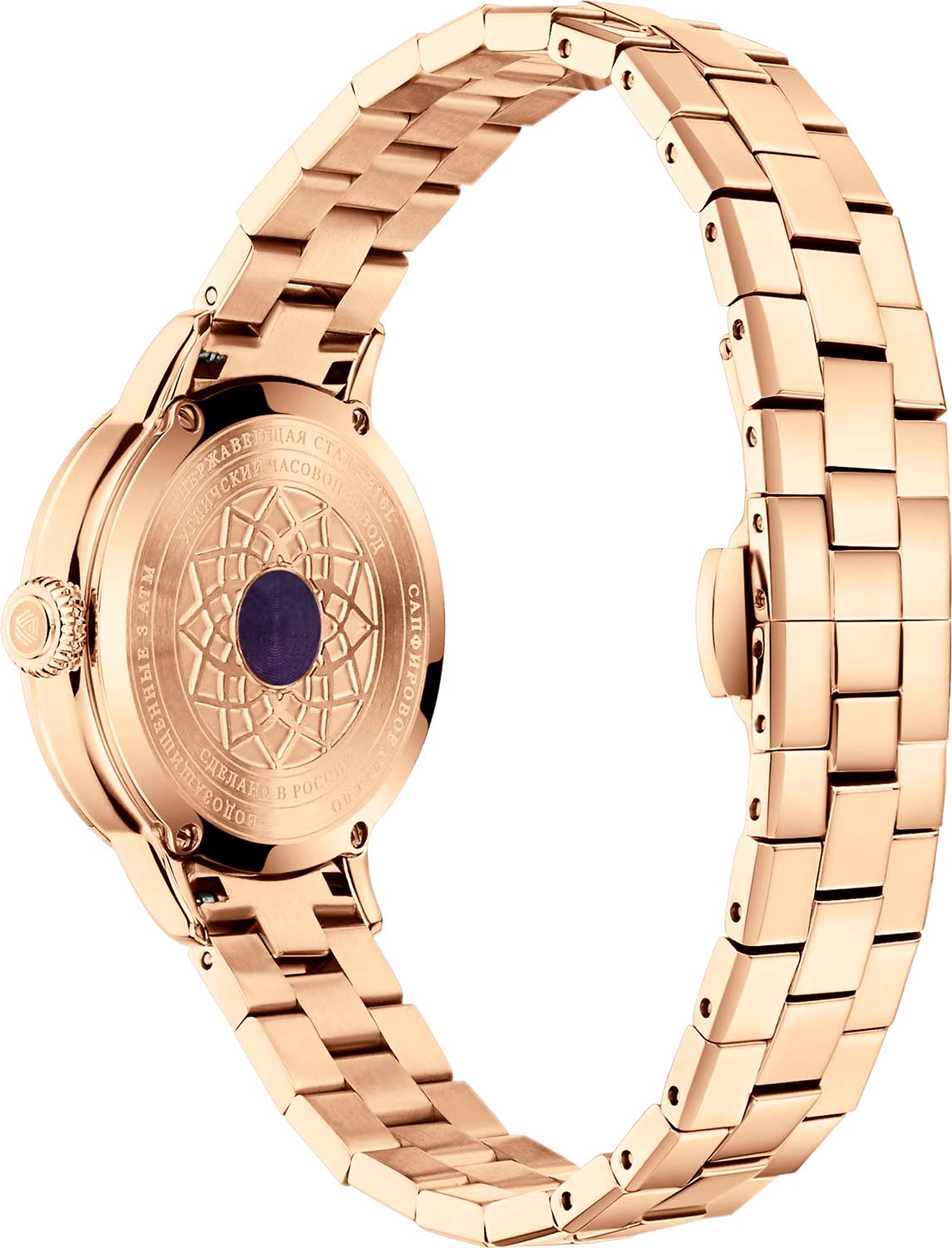 Секундная стрелка отсутствует. Рифленая заводная головка. Задняя крышка крепится на 4 винтах и украшена рельефным узором с флюоритом. Стальной браслет с застежкой-бабочкой.