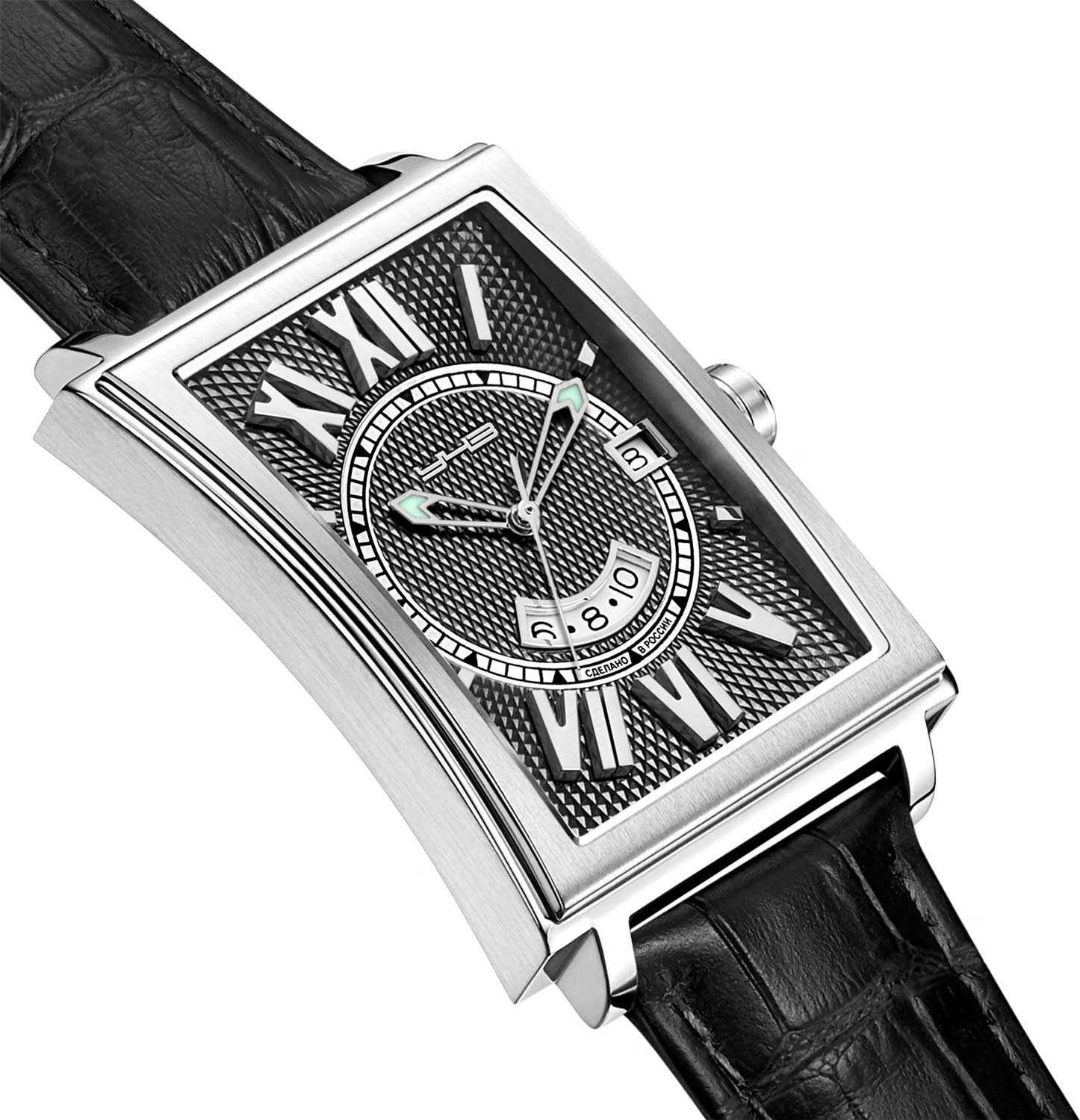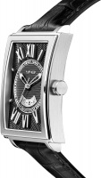 Окошко даты находится в положении 3 часа. Индикатор второго часового пояса в положении 6 часов. Гладкая заводная головка. Задняя крышка крепится на 4 винтах. Ремешок из натуральной кожи с застежкой-бабочкой.