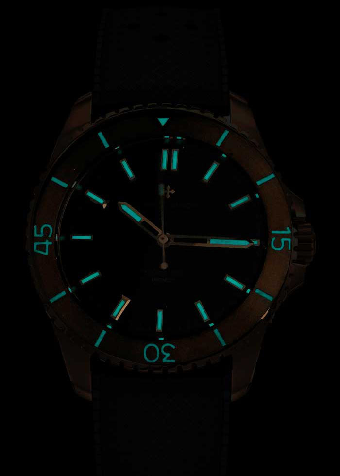 Накладные метки в виде штрихов. Заостренные прямоугольные стрелки в стиле Baton. Стрелки и метки часов с люминесцентным покрытием Super-LumiNova BGW9, они белые при дневном свете, а после зарядки излучают яркое сине-зеленое свечение в условиях низкой освещенности.