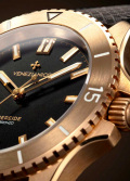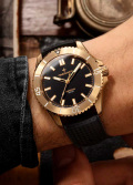 Круглый бронзовый корпус с матовой и полированной отделкой. Рифленый однонаправленный безель на 120 щелчков. Матовый зернистый циферблат с фирменным логотипом.