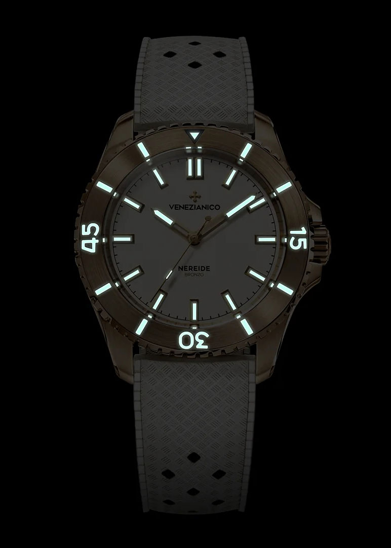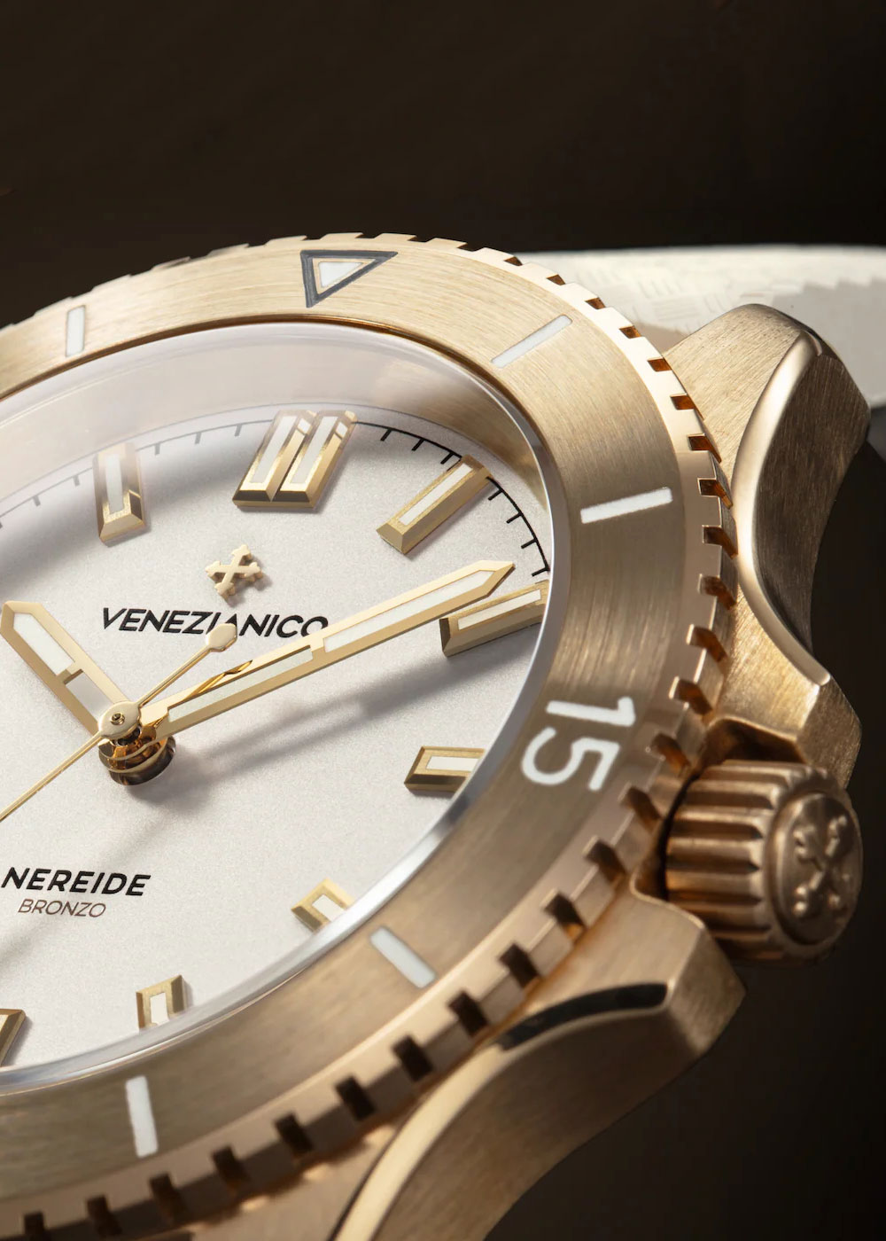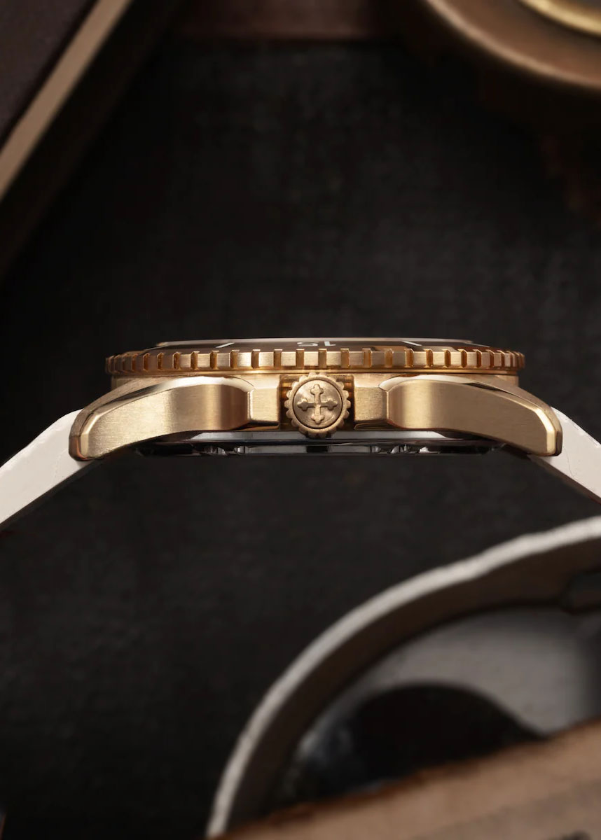 В механизме 24 камня, частота 28800 полуколебаний в час. Запас хода 42 часа. Круглый корпус из бронзового сплава QAI9-4, который со временем вступает в реакцию с окружающей средой и покрывается уникальной патиной, делая каждый экземпляр часов неповторимым. Рифленый однонаправленный безель на 120 щелчков. Матовый зернистый циферблат с фирменным логотипом.
