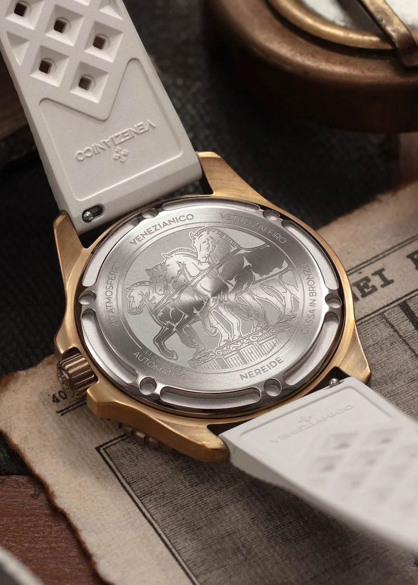 Плоское сапфировое стекло с антибликовым покрытием. Рифленая заводная головка с защитой. Задняя крышка крепится на 6-ти винтах и украшена выгравированным изображением бронзовой четверки Святого Марка. Удобный каучуковый ремешок с классической застежкой. Система быстрой замены ремешка.