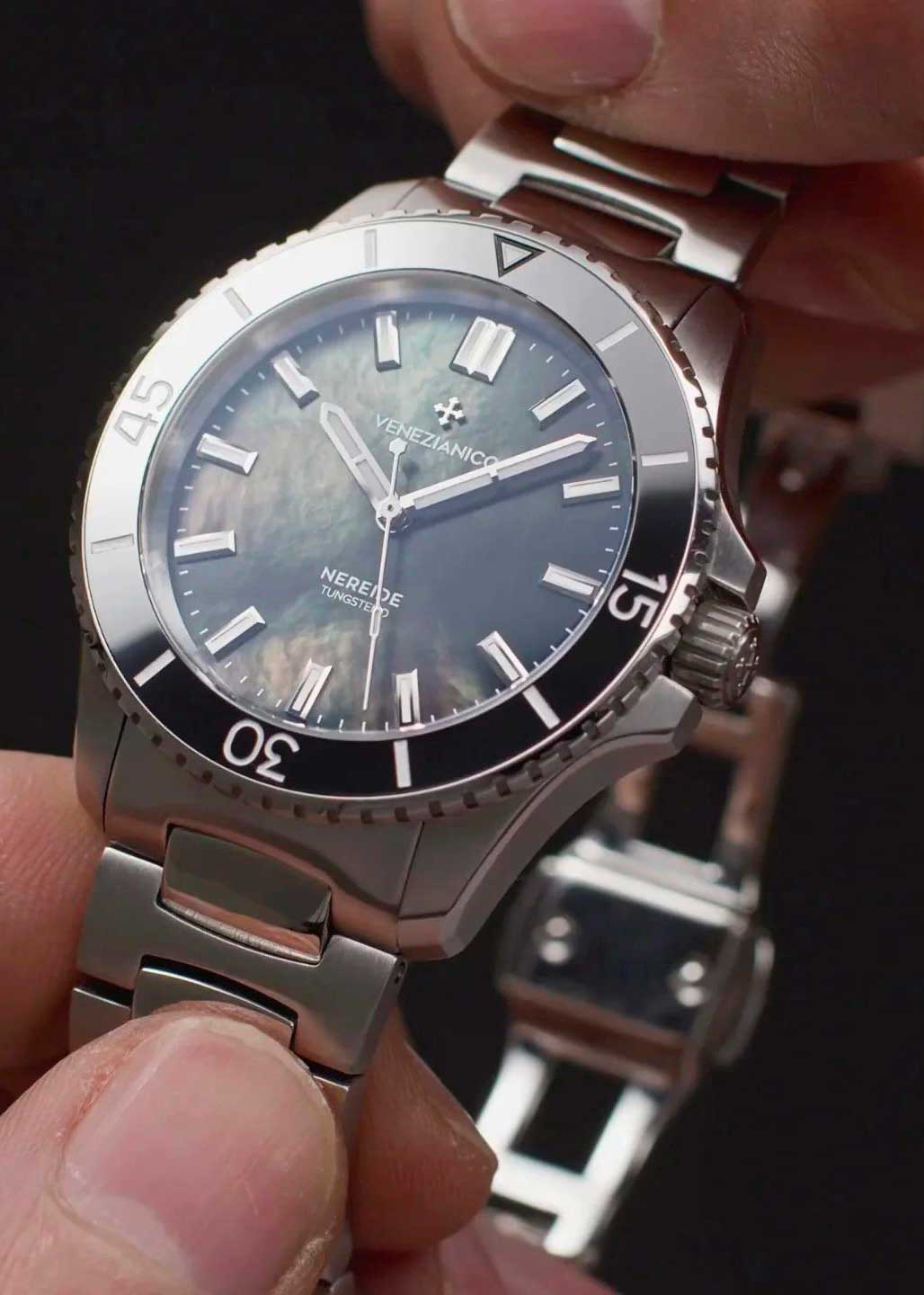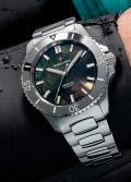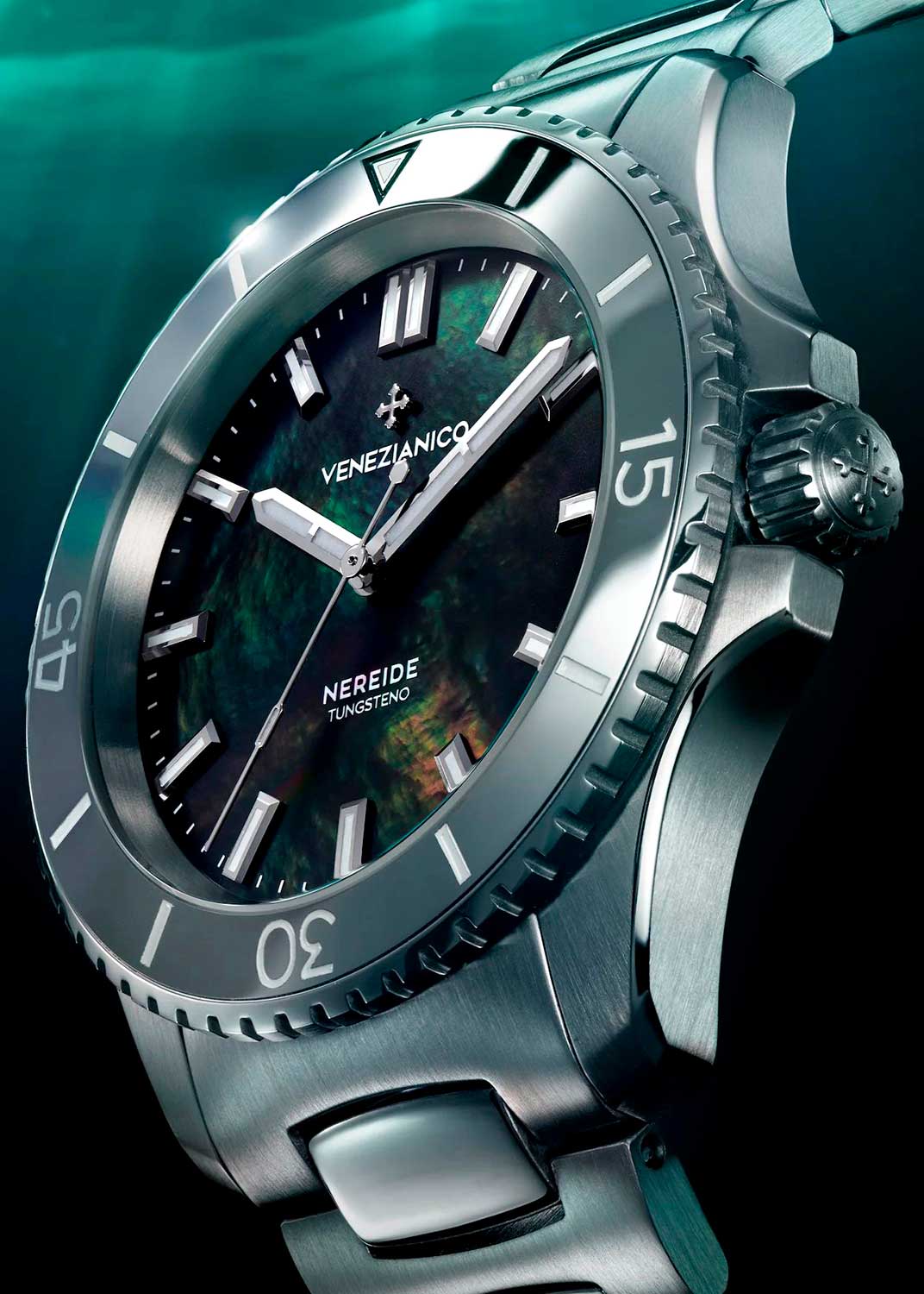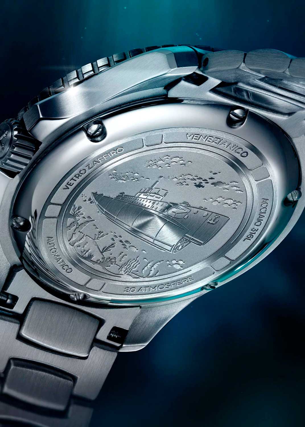 Стрелки и метки часов с новейшим люминесцентным покрытием Super-LumiNova BGW9, они белые при дневном свете, а после зарядки излучают яркое сине-зеленое свечение в условиях низкой освещенности. Рифленая заводная головка с защитой. Задняя крышка крепится на 6-ти винтах и украшена выгравированным изображением подводной лодки Nereide. Стальной браслет Canova с раскладывающейся застежкой.