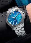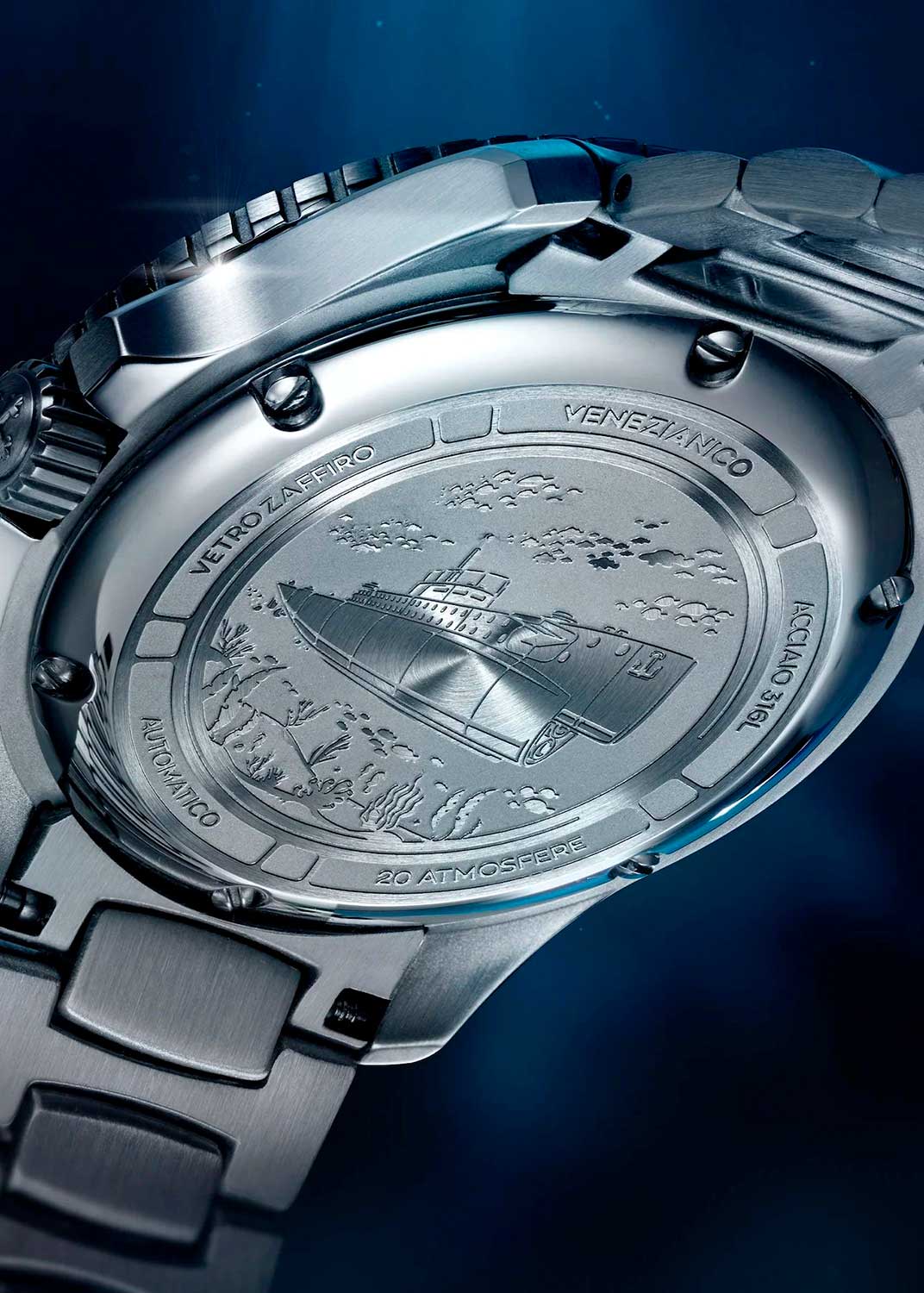 Стрелки и метки часов с новейшим люминесцентным покрытием Super-LumiNova BGW9, они белые при дневном свете, а после зарядки излучают яркое сине-зеленое свечение в условиях низкой освещенности. Рифленая заводная головка с защитой. Задняя крышка крепится на 6-ти винтах и украшена выгравированным изображением подводной лодки Nereide. Стальной браслет Canova с раскладывающейся застежкой.