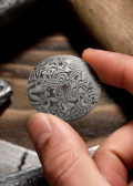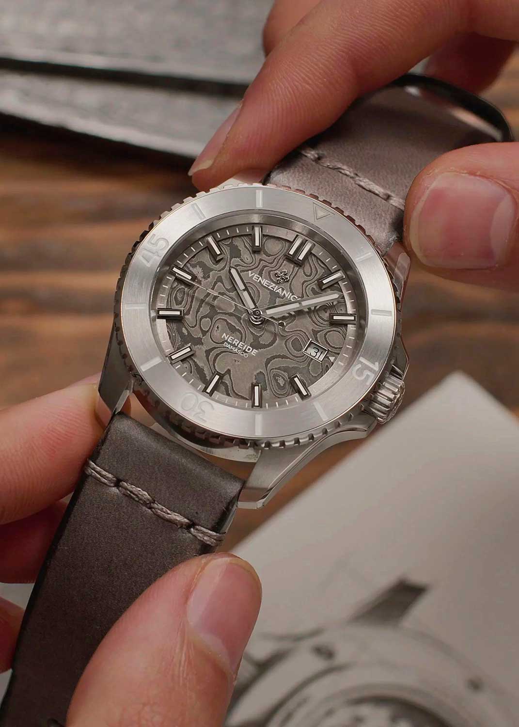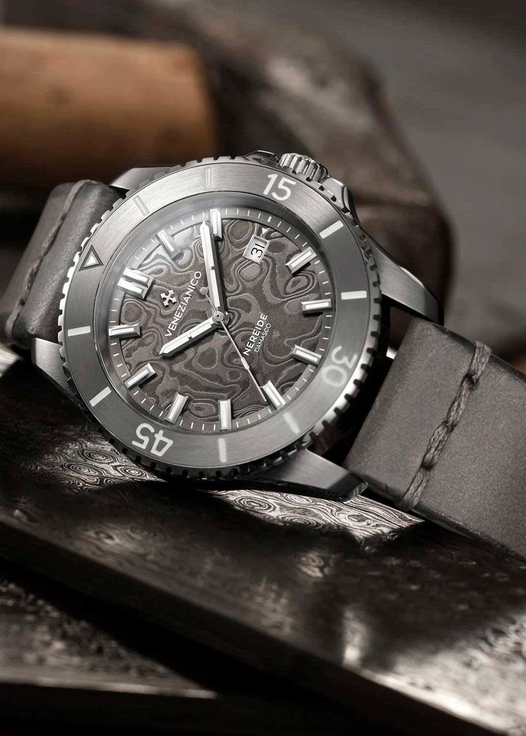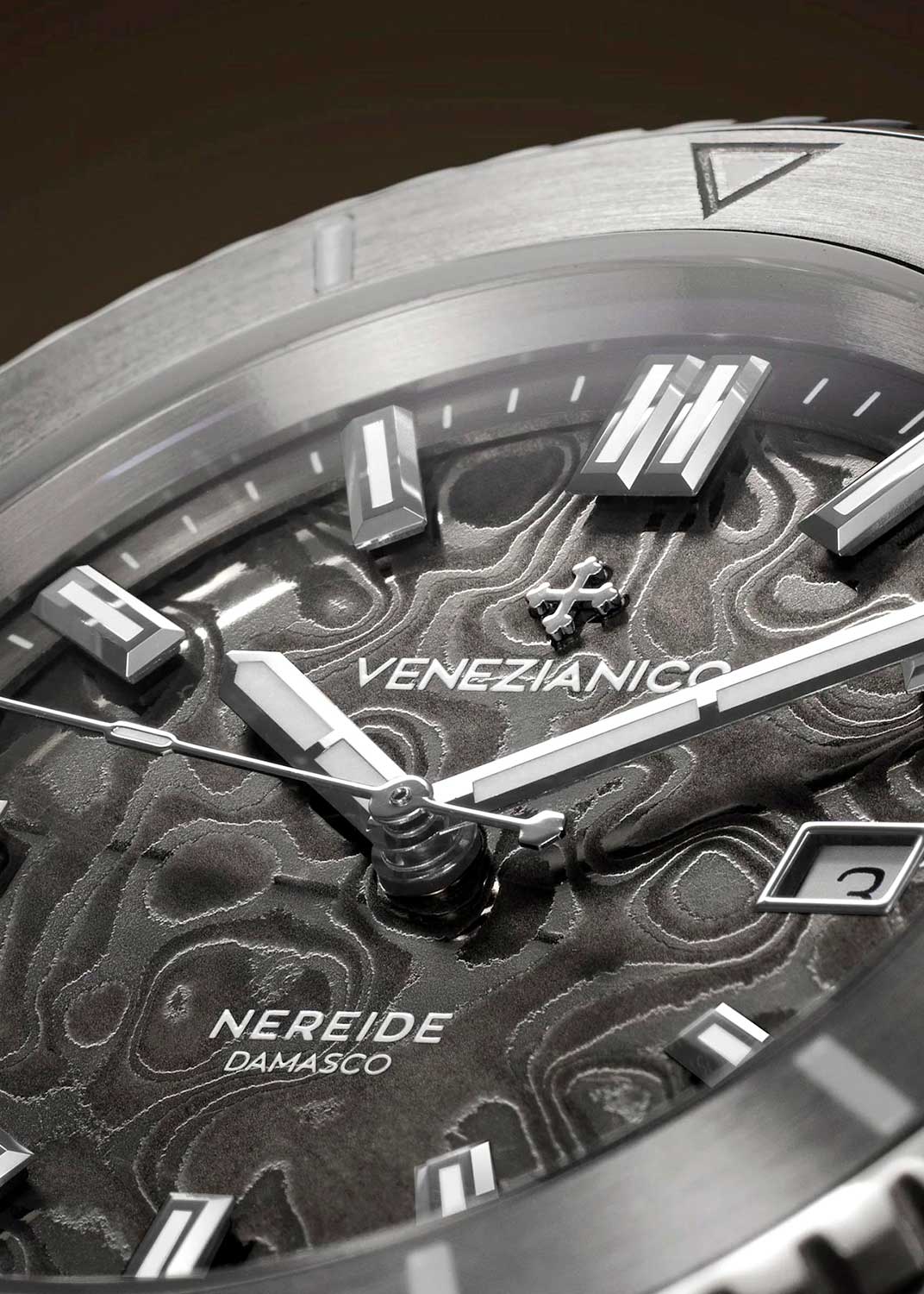 Циферблат выполнен из настоящей кованой дамасской стали, которая создает уникальные узоры на каждом экземпляре. Накладные метки в виде штрихов. Заостренные прямоугольные стрелки в стиле Baton.