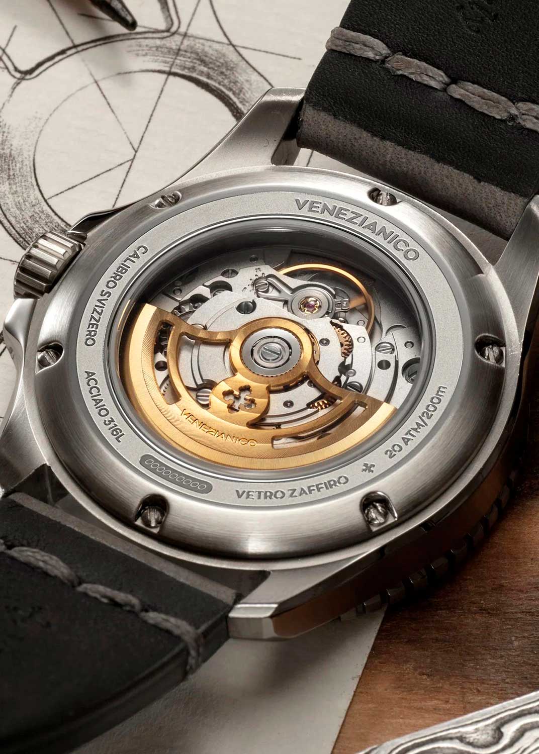 Задняя крышка с сапфировым стеклом крепится на 6-ти винтах. Удобный кожаный ремешок с классической застежкой.