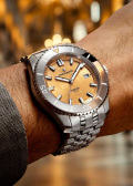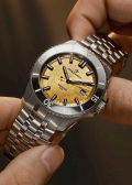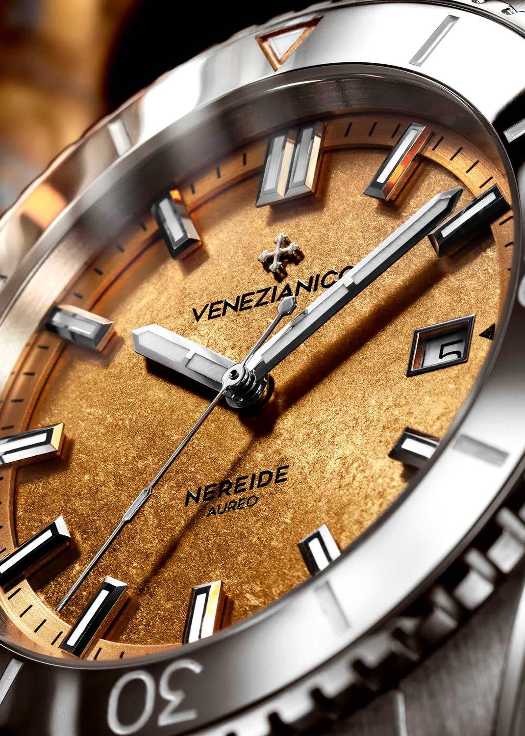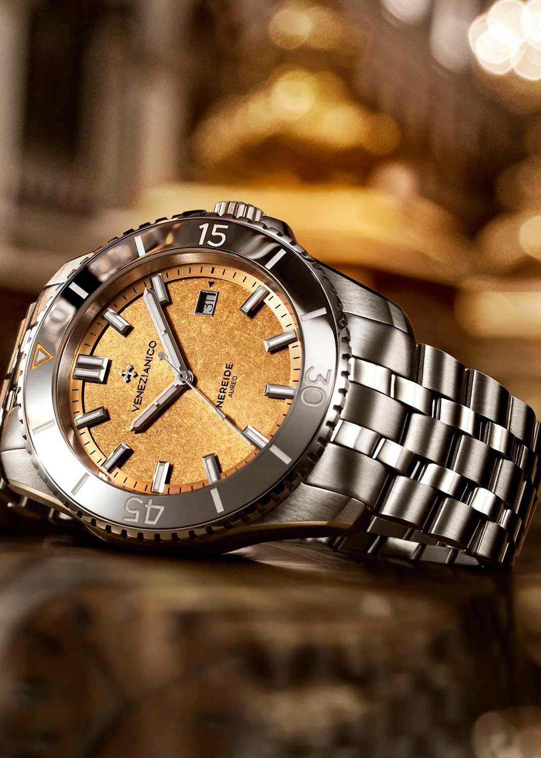 В механизме 24 камня, частота 28800 полуколебаний в час. Функция остановки секундной стрелки. Круглый стальной корпус с сатинированной и полированной отделкой. Рифленый безель с вольфрамовой вставкой, прочной и устойчивой к царапинам, рассчитан на 120 щелчков. Циферблат с покрытием из 24-х каратного золота с рифленой отделкой, напоминающей о древнем венецианском искусстве ламинирования.