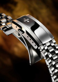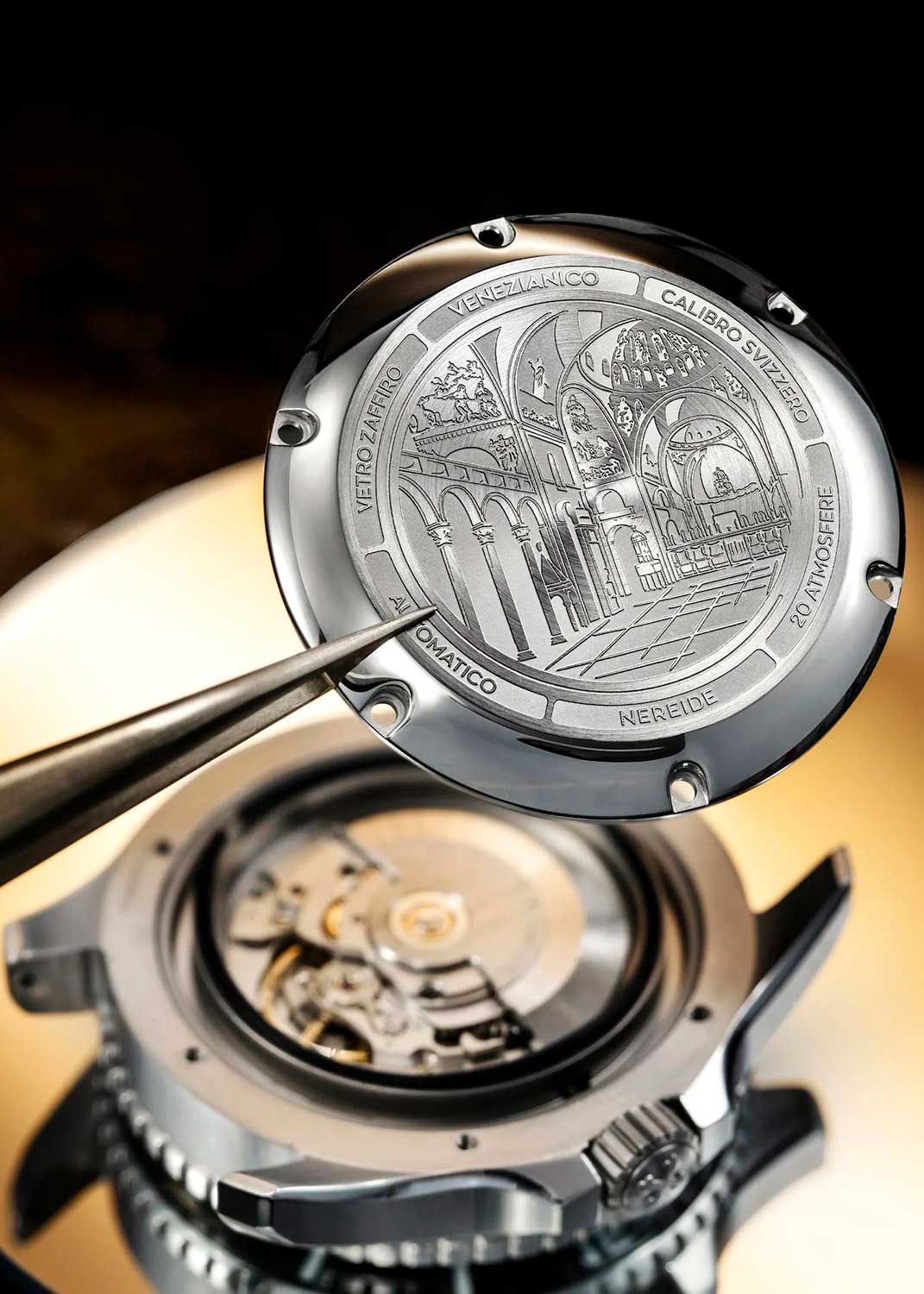 Задняя крышка крепится на 6-ти винтах и украшена выгравированным изображением храма Basilica del Santissimo Redentore. Стальной браслет Sansovino с полированными и сатинированными звеньями и микрорегулируемой застежкой, обеспечивающей прочность и максимальный комфорт на запястье.