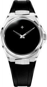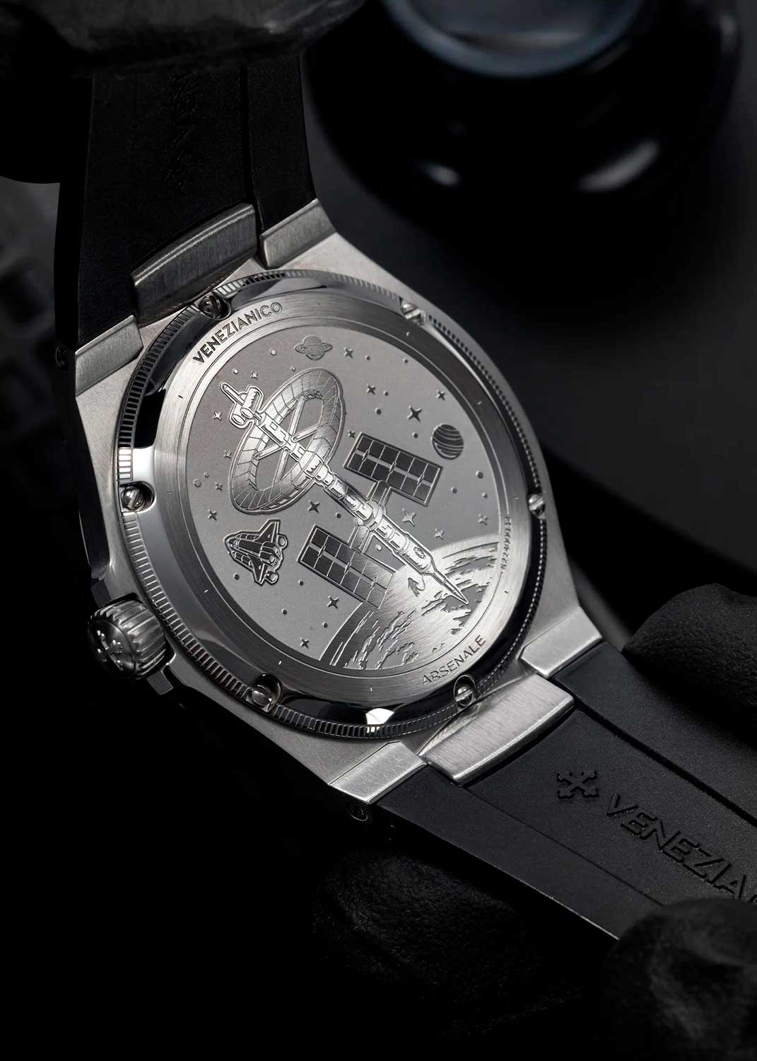 Метки отсутствуют. Клиновидные стрелки в стиле Dauphine. Рифленая заводная головка с защитой. Задняя крышка крепится на 6-ти винтах и украшена выгравированным изображением космической станции, символизирующей путешествие к новым горизонтам – подобно тому, как исторический Арсенал служил отправной точкой для смелых экспедиций в неизведанные земли. Удобный каучуковый ремешок с классической застежкой.