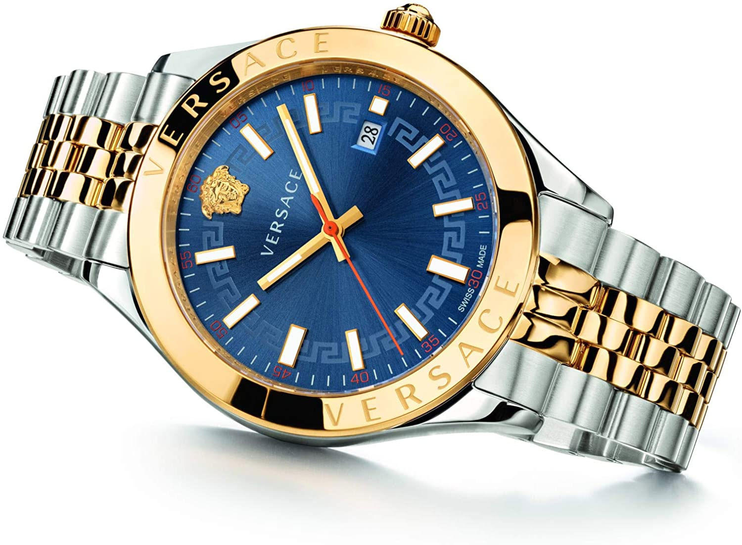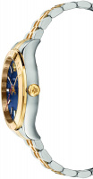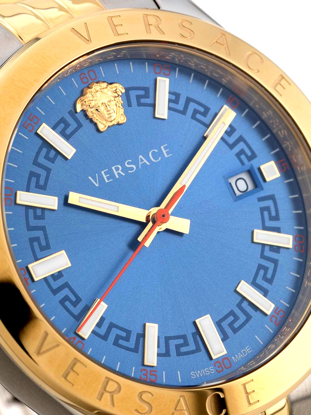 украшен выгравированными надписями ''Versace''. Циферблат выполнен по технологии Sunray (солнечные лучи) и украшен меандровым орнаментом. Прямоугольные стрелки и метки в виде штрихов с люминесцентным