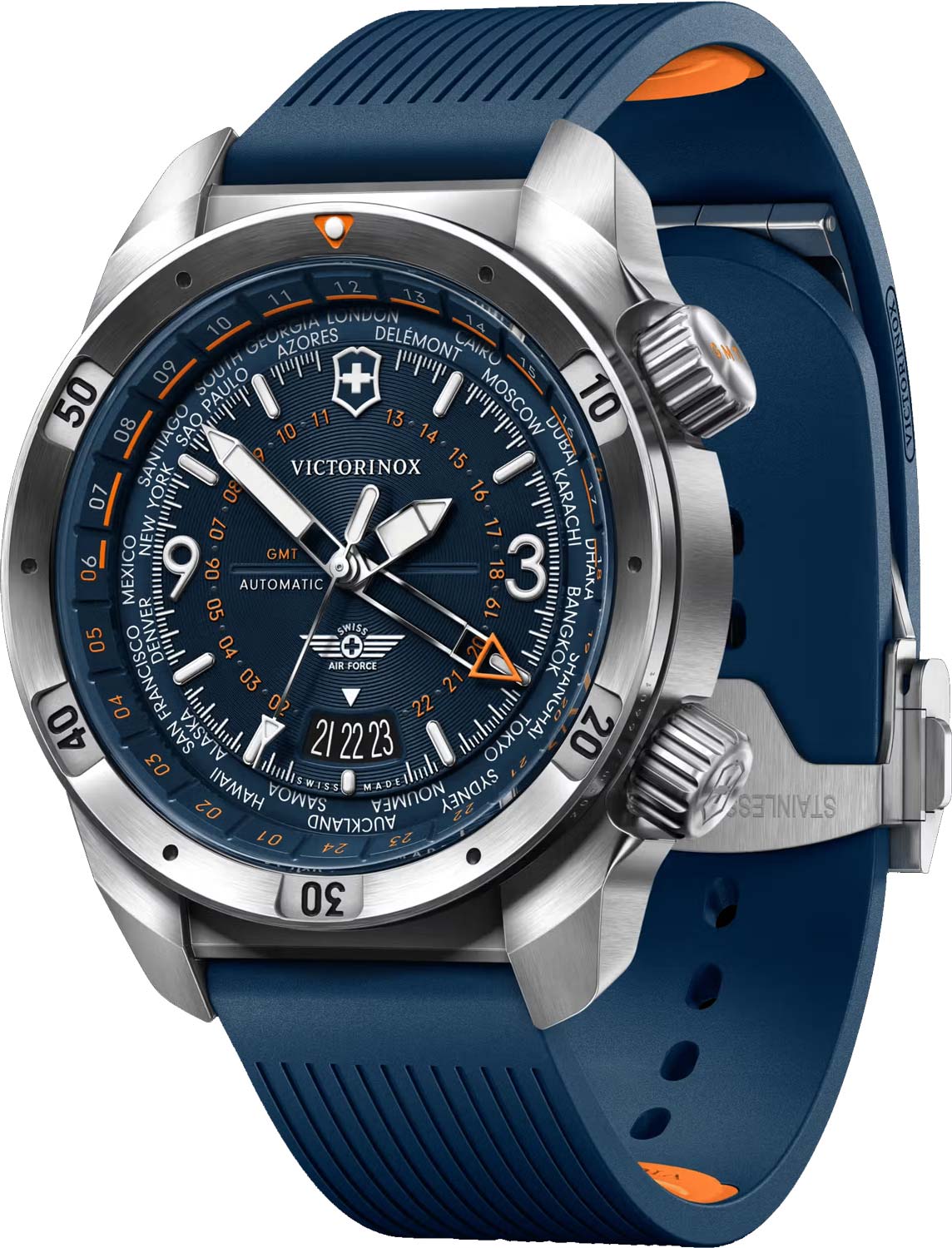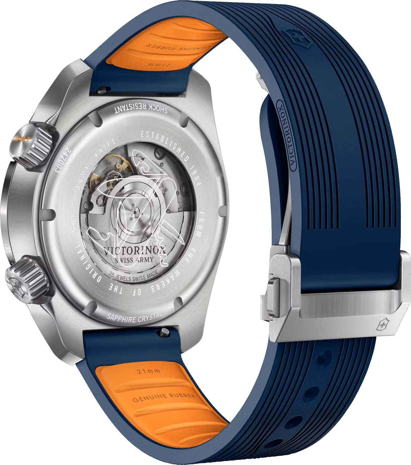 Окошко даты находится в положении 6 часов. Люминесцентные стрелки и метки SuperLuminova, которые светятся в темноте после непродолжительной зарядки на свету. Две рифленые закручивающиеся заводные головки. Головка в положении 4 часа управляет временем и секундами, головка в положении 2 часа управляет функциями GMT. Прозрачная завинчивающаяся задняя крышка. Резиновый ремешок с раскладывающейся застежкой и системой быстрой замены.