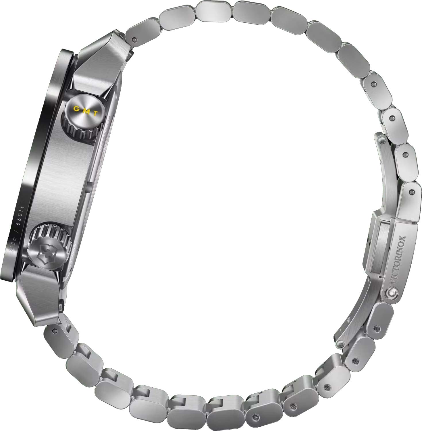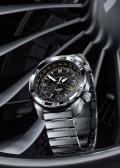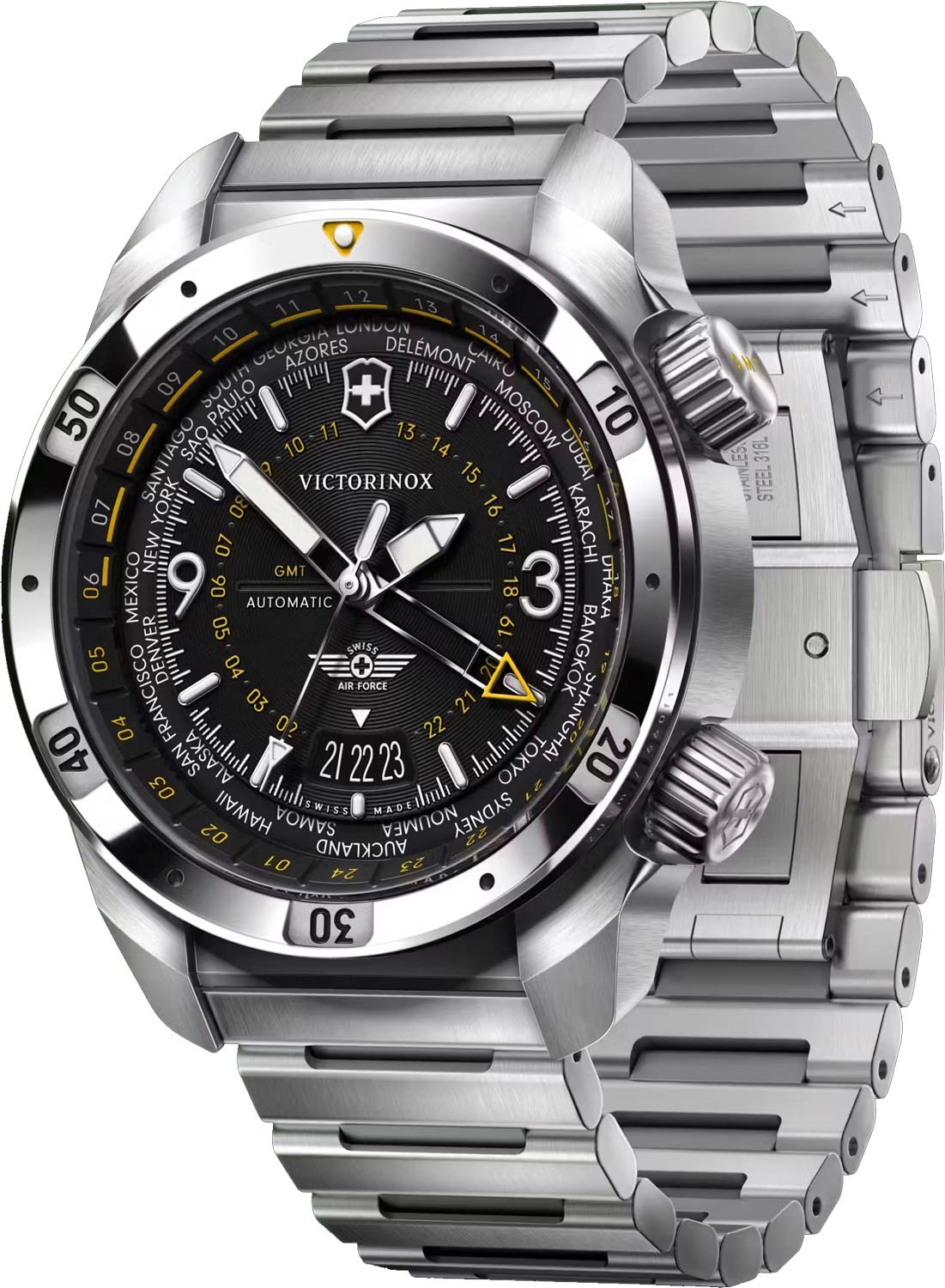 Окошко даты находится в положении 6 часов. Люминесцентные стрелки и метки SuperLuminova, которые светятся в темноте после непродолжительной зарядки на свету. Две рифленые закручивающиеся заводные головки. Головка в положении 4 часа управляет временем и секундами, головка в положении 2 часа управляет функциями GMT. Прозрачная завинчивающаяся задняя крышка. Надежный стальной браслет с раскладывающейся застежкой.