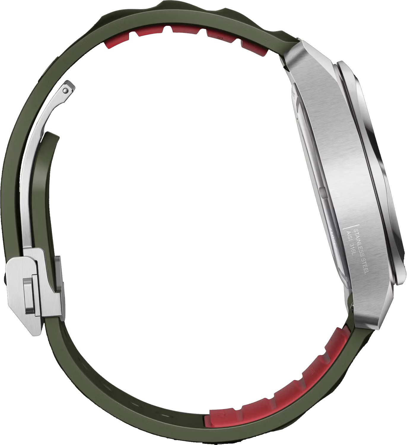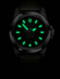 Люминесцентные стрелки и метки SuperLuminova, которые светятся в темноте после непродолжительной зарядки на свету. Окошко даты находится в положении 6 часов. Рифленая заводная головка с защитой. Прозрачная завинчивающаяся задняя крышка. Резиновый ремешок с раскладывающейся застежкой и системой быстрой замены.