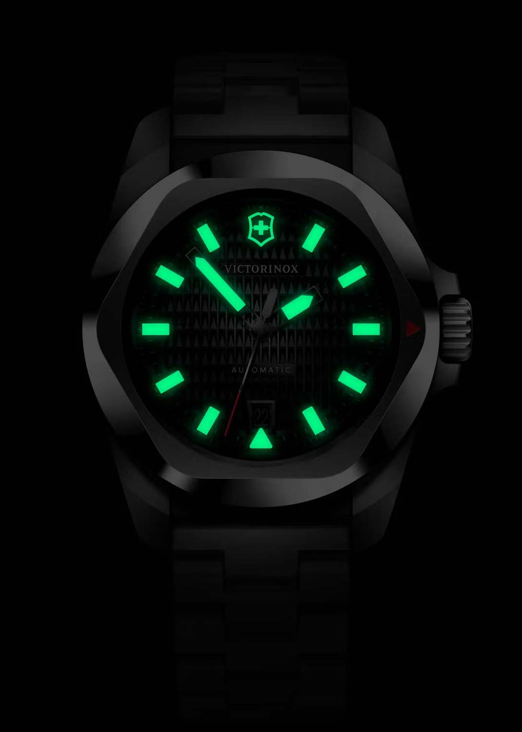 Люминесцентные стрелки и метки SuperLuminova, которые светятся в темноте после непродолжительной зарядки на свету. Окошко даты находится в положении 6 часов. Рифленая заводная головка с защитой. Прозрачная завинчивающаяся задняя крышка. Надежный стальной браслет с раскладывающейся застежкой.