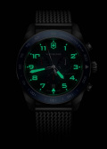 Люминесцентные стрелки и метки SuperLuminova, которые светятся в темноте после непродолжительной зарядки на свету. Рифленая заводная головка. Завинчивающаяся задняя крышка. Надежный и удобный стальной браслет миланского плетения с регулируемой застежкой.