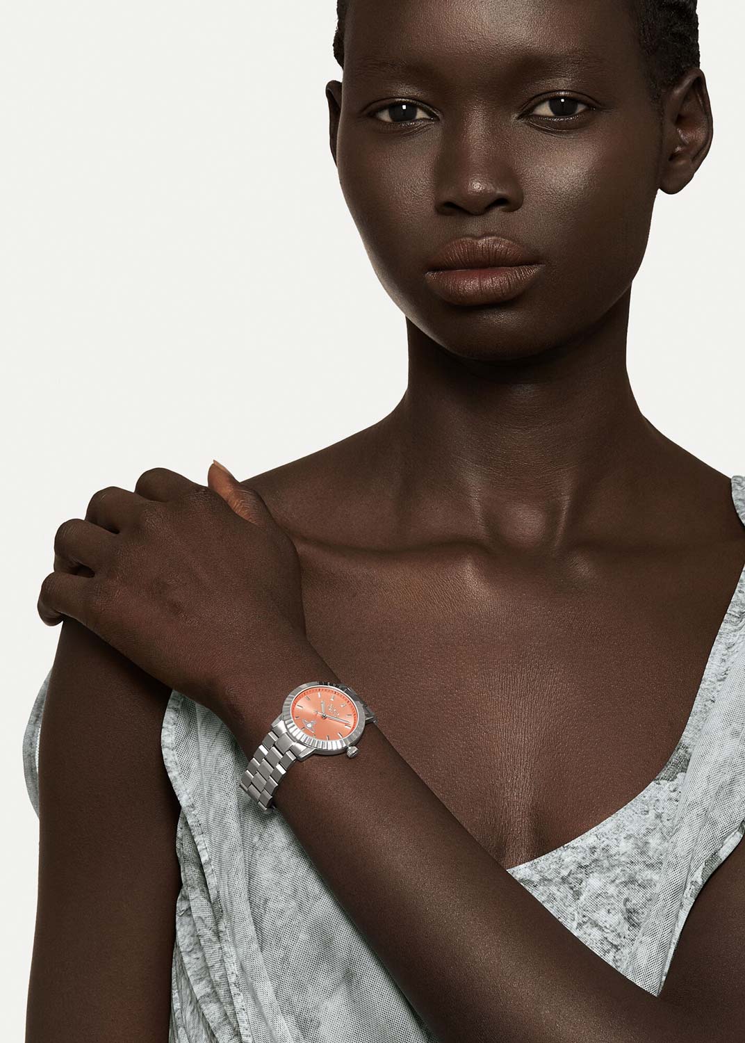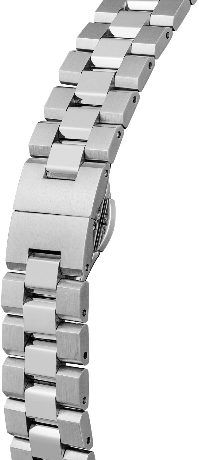 Окошко даты находится в положении 6 часов. Заостренные прямоугольные стрелки в стиле Baton. Рифленая заводная головка. Удобный стальной браслет с раскладывающейся застежкой.