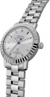 Окошко даты находится в положении 6 часов. Заостренные прямоугольные стрелки в стиле Baton. Рифленая заводная головка. Удобный стальной браслет с раскладывающейся застежкой.