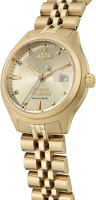 Скелетонизированные стрелки. Окошко даты с увеличительным стеклом находится в положении 3 часа. Рифленая заводная головка. Удобный стальной браслет с раскладывающейся застежкой.