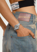 Метки в виде штрихов с люминесцентным покрытием и точек, украшенных восемью кристаллами. Заостренные прямоугольные стрелки в стиле Baton. Рифленая заводная головка с защитой. Удобный стальной браслет с раскладывающейся застежкой.