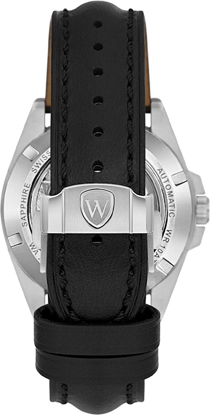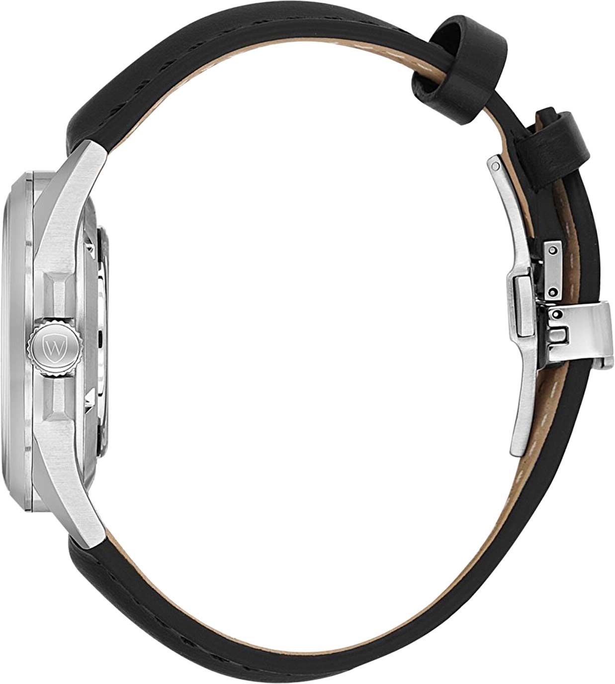 Прямоугольные стрелки в стиле Baton. Секундная стрелка на конце декорирована буквой W. Рифленая заводная головка с защитой. Завинчивающаяся задняя крышка. Удобный кожаный ремешок с раскладывающейся застежкой.