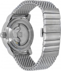 Серебристые накладные метки в виде штрихов. Окошко даты в положении 3 часа. Клиновидные стрелки в стиле Dauphine. Высококупольное минеральное стекло. Прозрачная задняя крышка. Рифленая заводная головка из нержавеющей стали. Цельный стальной браслет миланского плетения с удобной раскладывающейся застежкой.