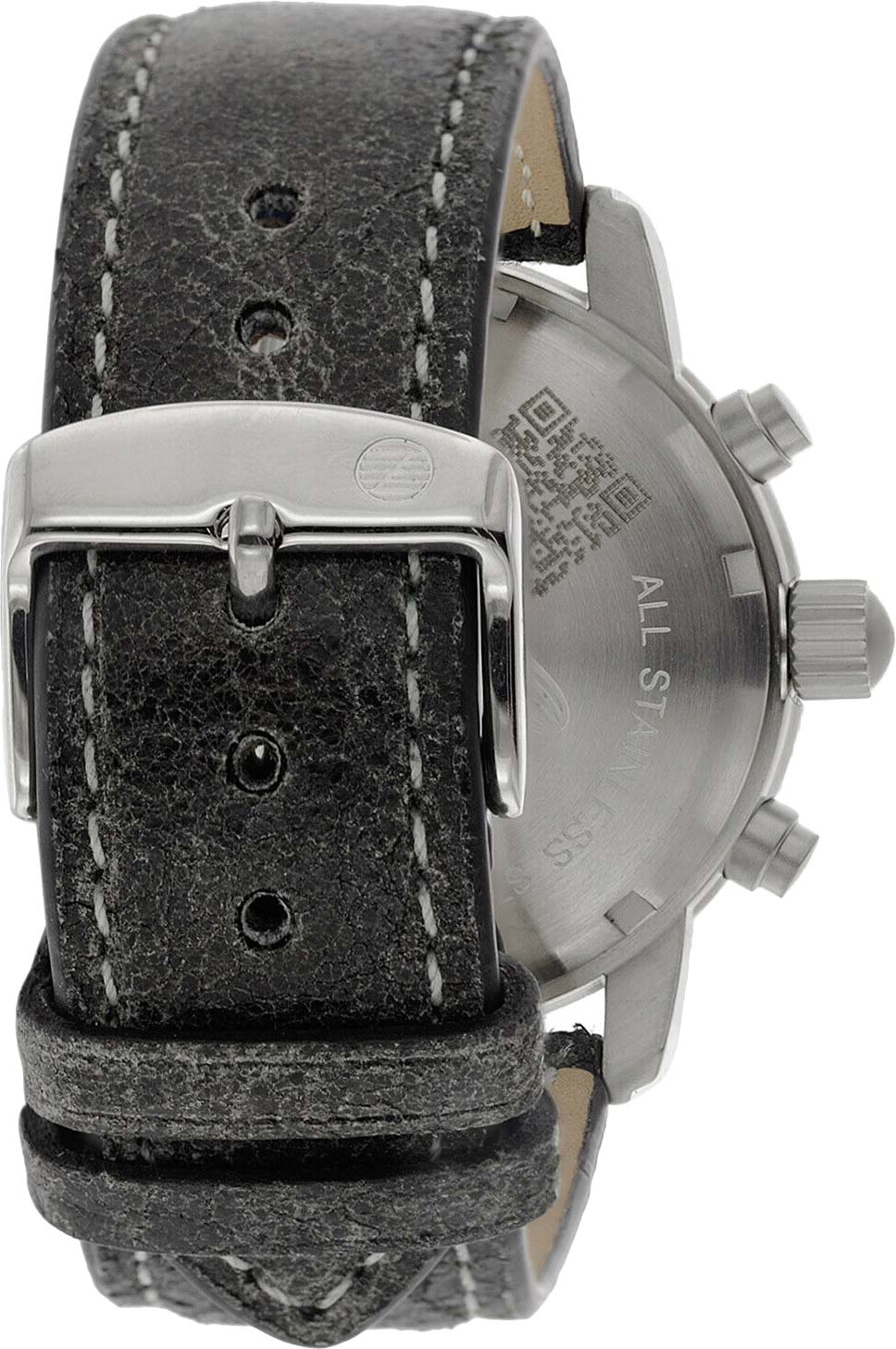 Корпус диаметром 42 мм выполнен из нержавеющей стали, защищён стойким к повреждениям минеральным стеклом K1. Светлый, почти серебристый циферблат оформлен крупными чёрными арабскими цифрами и снабжён тремя вспомогательными шкалами. Особое внимание привлекает комбинация тахиметрической и телеметрической шкалы — элементы, без которых невозможно представить часы 30-х годов прошлого века. Форма стрелок, деликатная насечка и лаконичная дата в положении «4 часа» придают модели законченность и визуальный баланс.