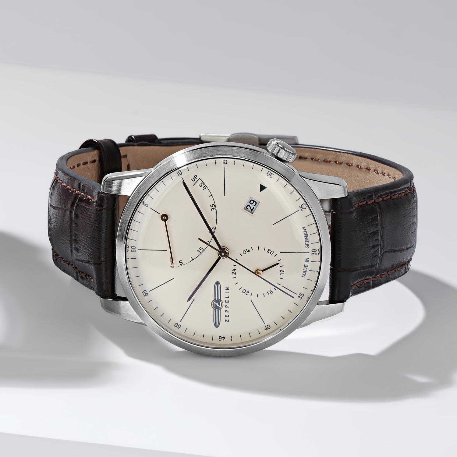 Циферблаты Zeppelin узнаваемы с первого взгляда: арабские цифры, скруглённые стрелки, шлицевая текстура, вдохновлённая корпусом дирижабля, и чёткая шкала. В коллекциях встречаются как чисто авиационные решения (GMT, тахиметр, хронографы), так и ретро-модели в духе 1930-х. Размеры корпуса варьируются от элегантных 36 мм до 43 мм — на любой вкус и запястье.